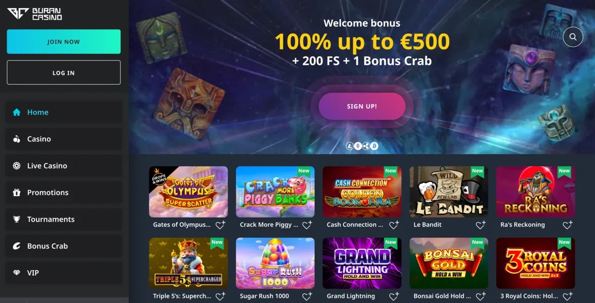 Dès l'arrivée sur le site, on est frappé par le design soigné. L'interface de Buran Casino est à la fois moderne et fonctionnelle, offrant une navigation fluide qui permet de passer d'une machine à sous à une table de blackjack en un clin d'œil. Contrairement à de nombreux sites surchargés, Buran mise sur une clarté visuelle qui facilite l'expérience utilisateur, même pour les débutants.