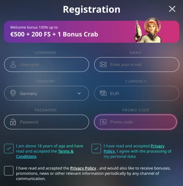 - Une fenêtre s'ouvrira présentant le Bonus de Bienvenue (100 % jusqu'à 500 € + 200 FS + 1 Bonus Crab).
